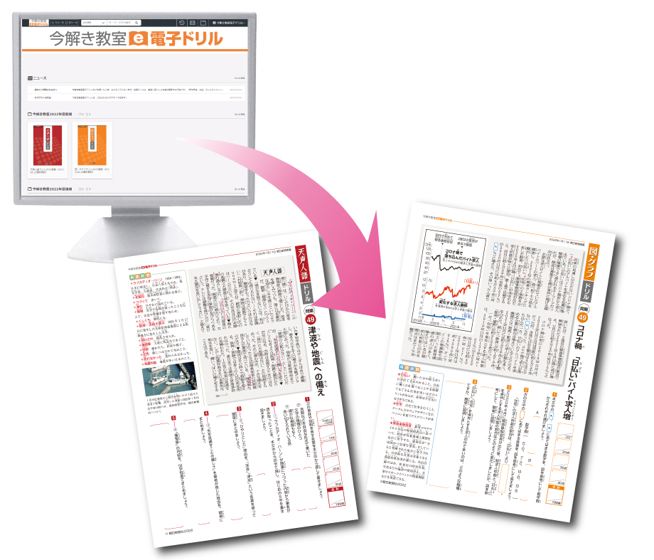 電子ブックにアップされるドリルを紙に印刷して、記事の読解や要約、時事用語確認ができます。